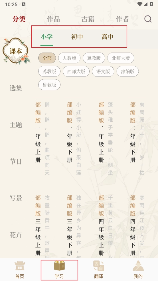 4. 切换学习板块,按小学到高中分类查找诗词,进行背诵或研读。