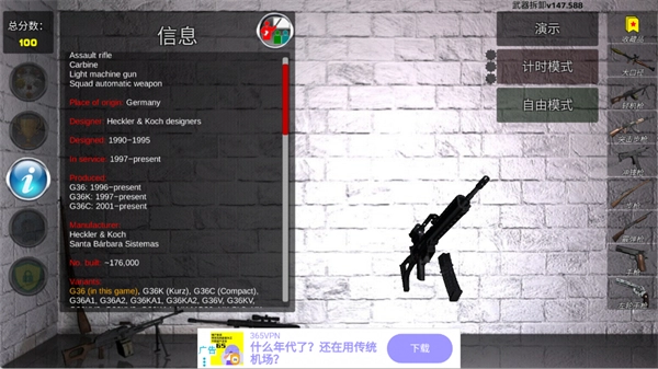 支持自定义更换零件和涂装,个性化设计武器外观。射击测试模式模拟后坐力,测试组装成果,不同场景如近距离靶场调整难度。四种基础模式:演示学习步骤,操作自由练习,拆解/组装分步执行。新版本加入50倍慢动作解析气体流动,不过AR功能需手机兼容。