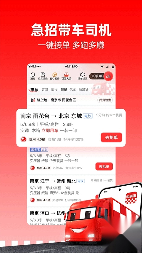 运满满司机版提升配货效率,身份验证后实时接单,路线规划实用。