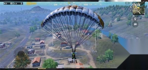 本战术适用于四人组队模式,需队员协同执行。推荐跳伞区域选择沿河侧高地(地图标注蓝房及仓库区域),该区域具备三大优势: