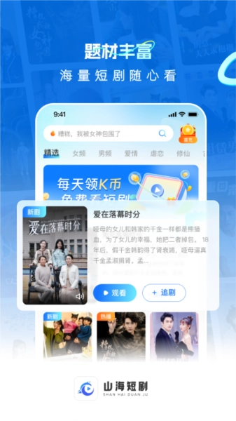 山海短剧是一款专为短剧爱好者打造的移动应用,提供海量精选作品,覆盖爱情、悬疑、古装等多种题材。用户通过手机或平板随时随地享受高清画质的观影体验,智能推荐系统根据个人偏好推送新剧,简化发现流程。平台支持离线缓存功能,无网络时也能继续观看,每日登录和任务奖励让用户免费获取更多内容。观看记录自动保存,下次打开无缝衔接播放。社区互动功能允许评论、点赞和分享,与其他剧迷交流心得。丰富分类和搜索工具帮助快速定位心仪短剧,更新迅速确保内容新鲜。下载山海短剧APP,开启便捷、个性化的追剧之旅。