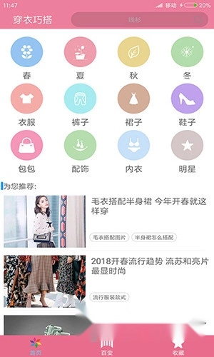 1. 下载安装并打开应用,首页展示春夏秋冬四季的穿搭资讯和分类;