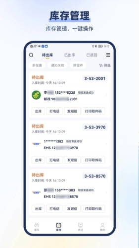 2、快递查询与管理:输入运单号或扫描条码查件,查看发货人、收货人、物流轨迹等详情。提供出库、异常标记、面单打印等功能,方便管理员操作。