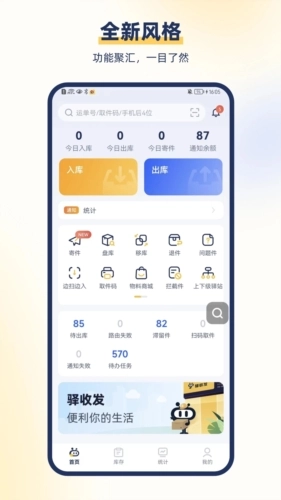 v4.8.5版本:快件极速出入库操作,自动识别条形码和收件信息。客户自助微信预约取件错峰处理。凭证面单云端储存随时调取。驿站专属二维码建立私域社区。微信、短信、支付宝和云呼多渠道通知。亲友包裹管理绑定手机号代收。催取、盘库、移库、接驳功能完善。