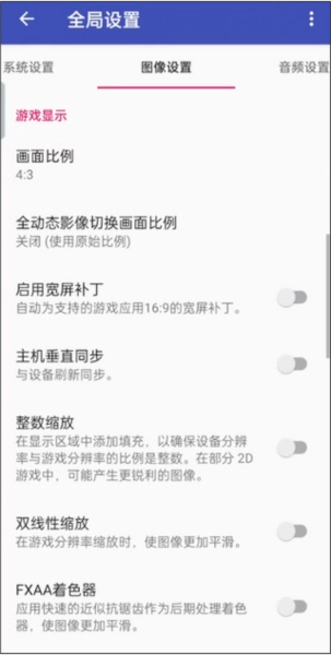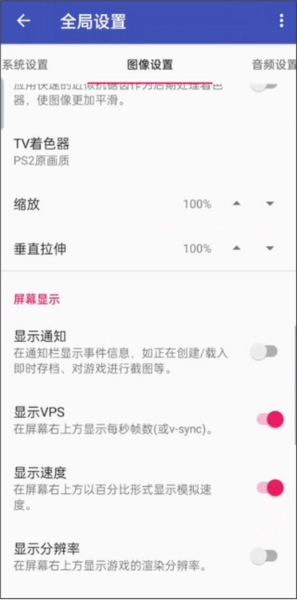 游戏显示:画面比例设为4:3,其他选项关闭。屏幕通知:开启显示VPS和显示速度,其余关闭。