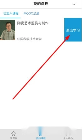 3、按住课程向左划动,点击右侧出现的“退出学习”按钮完成退出。