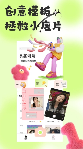 图片编辑:使用滤镜、贴纸、文字工具美化照片,裁剪多余部分。
