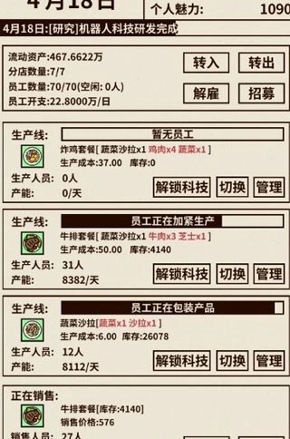 3、关于产品科技。除了第一天因为资金紧张,能点的就尽量点上,从第二天开始,所有科技都尽可能地点满。前期一定要控制好自己的资金!这里有一个有趣的现象:新产品刚研发出来就投入生产,往往不如已经满科技的老产品赚钱快。为了区分哪个更赚钱,你就得时刻关注你的资金变化来感受了。我通常是在一个产品的所有科技都点满之后再开始生产。(也有一些特殊情况,比如有一种新产品叫做羊毛什么的,它是为了给后续的羊毛衫做铺垫的,所以它的利润不如前一个产品高。这就是原材料和成品之间的区别。)游戏中还有一个小问题,电器公司只能卖到高端主板为止,因此后面的科技升级就没必要了。我是在增加了两条生产线并生产出普通手机后才发现这一点的,当时差点导致资金链断裂,吓得我赶紧又开了一个汽车公司。