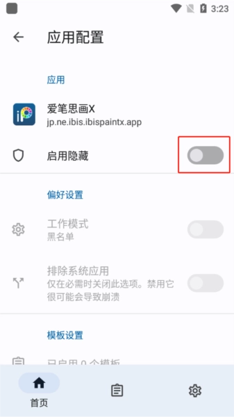 2、设备重启后打开应用,进入[模板管理]创建新模板。编辑黑名单勾选目标应用,完成配置后再次重启生效
