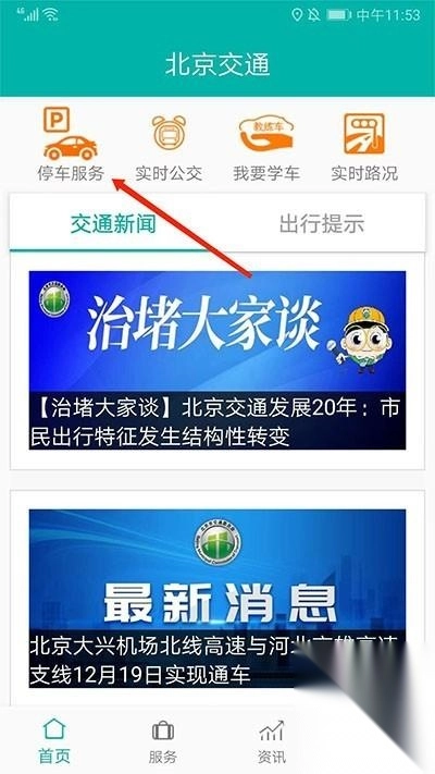 1、启动北京交通APP,点击首页"停车服务"图标;