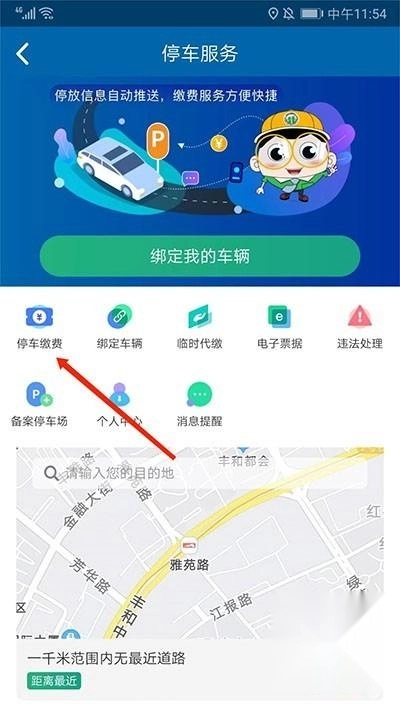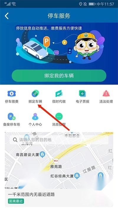 1、在"停车服务"界面选择"绑定车辆"功能;
