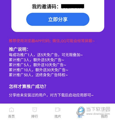 进入追风视频APP推广页面,获取专属二维码和邀请码。分享给未安装好友,对方通过扫码或输入邀请码下载启动后,即算推广成功。奖励机制:每成功1人送5天免广告;累计3人额外送5天;累计5人额外送10天;累计10人额外送30天;累计50人获终身免广告特权。