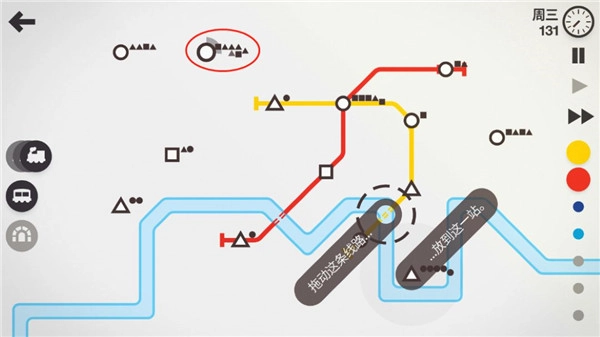 地铁规划需掌握三要素:站点属性、乘客流向与时间管理。圆形住宅区、方形枢纽站、三角形商业区构成基础网络,特殊图标站点需优先连通。左上角时间轴控制流速,每周获得资源后暂停布局更稳妥。