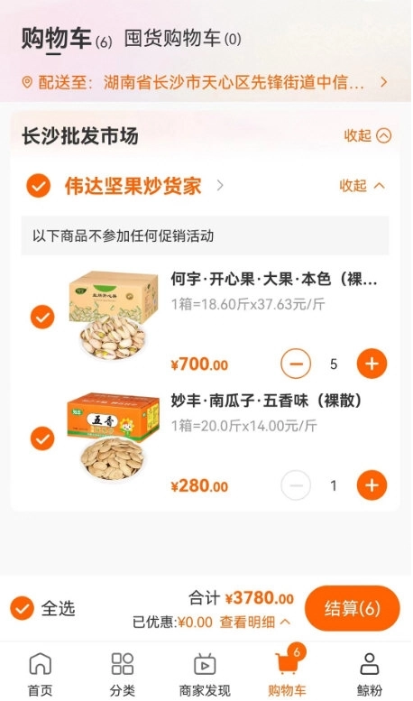 3、统一结算购物车商品,全选产品后一键付款;