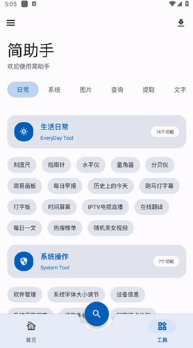 简助手是一款集成多场景解决方案的手机工具箱,集合了上百种实用功能,从日常测量到专业需求都能轻松应对。当需要测量角度、寻找特定音乐或处理文件时,只需开启应用即可快速完成。软件采用极简界面设计,全程无广告干扰,操作区域清晰直观。首页展示热门工具,用户可直接点击使用。若需更特定功能,可通过分类目录查找详细工具库,覆盖生活助手、系统优化、影音娱乐等场景,满足各类移动端需求。