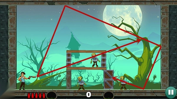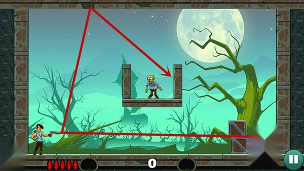 第一关:相对简单,直接瞄准僵尸射击即可。想一发过关,尝试不同角度寻找最佳轨迹。