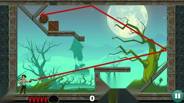 第二关:参考图中轨迹,一发子弹解决目标。若失败,可利用剩余子弹多试几次。
