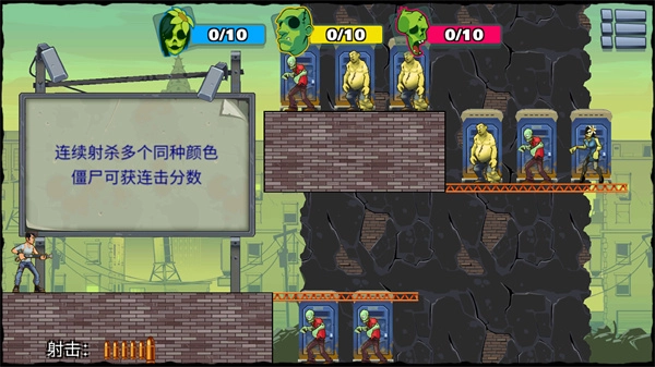 第三关:难度增加,先射击木箱使小箱掉落砸中僵尸。未命中的需单独瞄准。