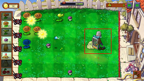 4、玩家需要使用相应的植物来攻击僵尸,一条路线上的植物只能攻击自己路线上的僵尸,每排都需要种植植物进行防御。