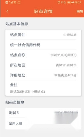 点击站点详情右上角的“编辑”按钮进入站点编辑页面,可编辑站点信息、扫码员信息;