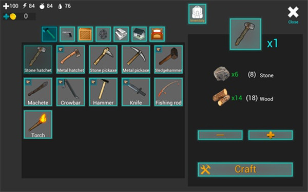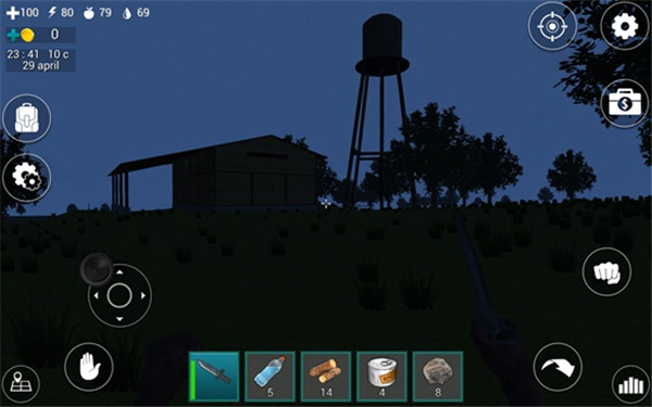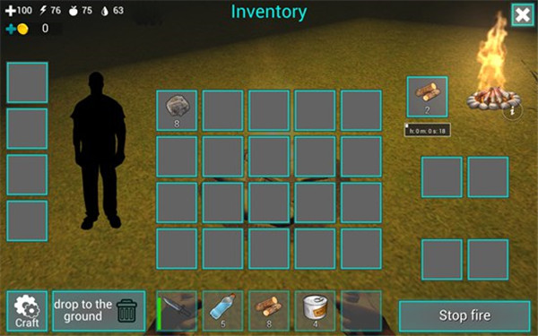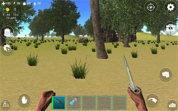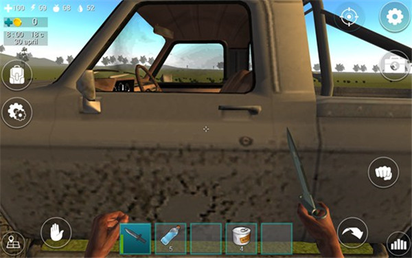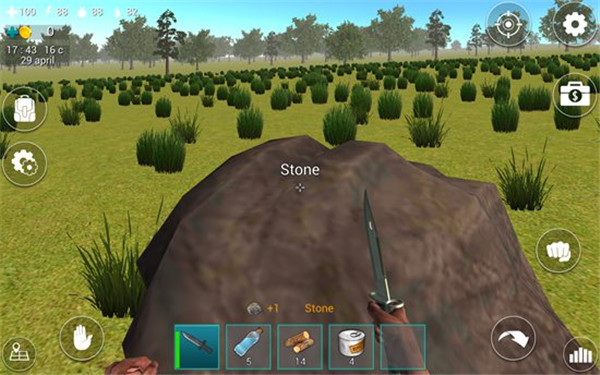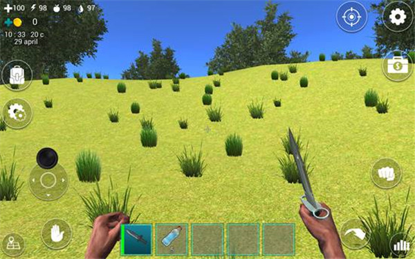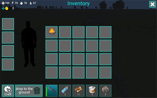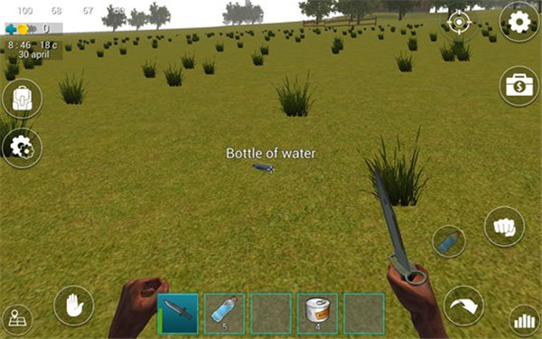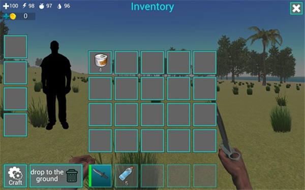 在屏幕下方的道具栏中有一把匕首和5瓶水,我们点击匕首即可拿在手中。在屏幕左上角有四个图标数字,分别表示血量、体力值、饥饿值、口渴值。