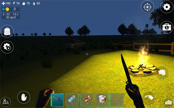 攻击野猪的时候,它也会攻击我们,小编建议大家前期不要去惹野猪,选择小鹿比较好,不过它受到攻击会逃跑,我们需要一边追一边攻击,直到它倒地,就能获得肉食了。有了水,有了肉、有了火堆和汽车,剩下的就是不断收集材料来提升自己的生活水平了。