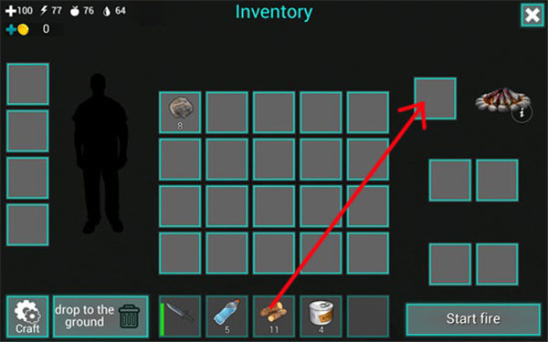 这时候会出现火堆和背包,我们要将木头拖动到火堆中才行,不然没有添加燃料,火堆是不会燃烧的。