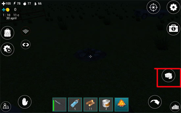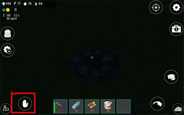 火堆放好后并不会燃烧,我们要对准火堆,点击屏幕左下角的“手掌”按钮开启火堆。