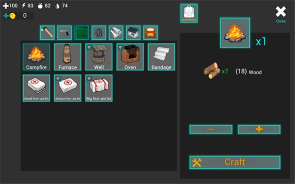 不过现在我们首先要做的还是一个火堆,制作一个火堆需要7个木头,点击火堆,然后点击右下角的“Craft”,即可制作出来。