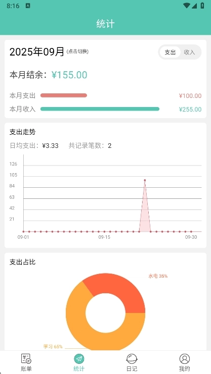 图表查看:首页切换"统计"页签,左右滑动切换月度趋势图与分类占比图