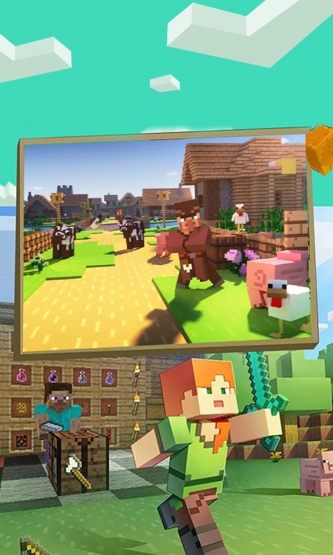 1、探索像素世界收集材料,打造装备武器抵抗动物侵袭家园;