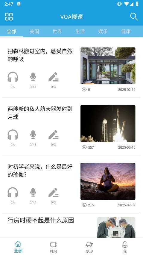 1. 访问魔趣网(m.mfun.com)下载并安装VOA慢速英语应用,启动后从首页挑选新闻或视频内容。