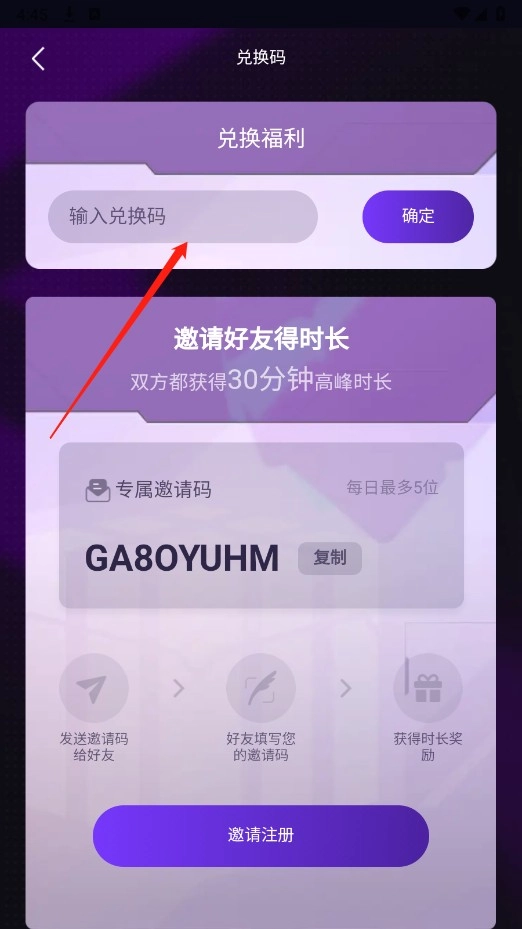 3、好友输入邀请码后生成兑换码,您输入该兑换码后双方均获得30分钟高峰游戏时长。
