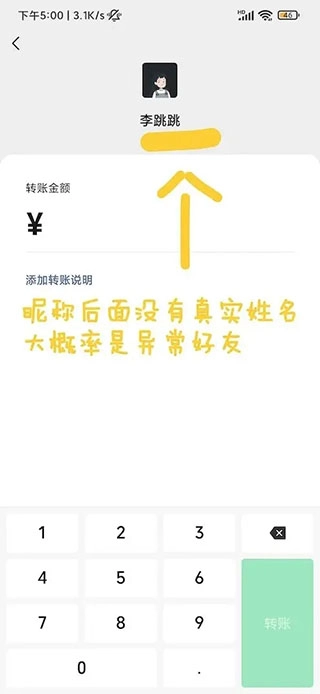 无姓名时输入任意金额点击转账(不扣费)。提示“你不是收款方好友”说明被删除。