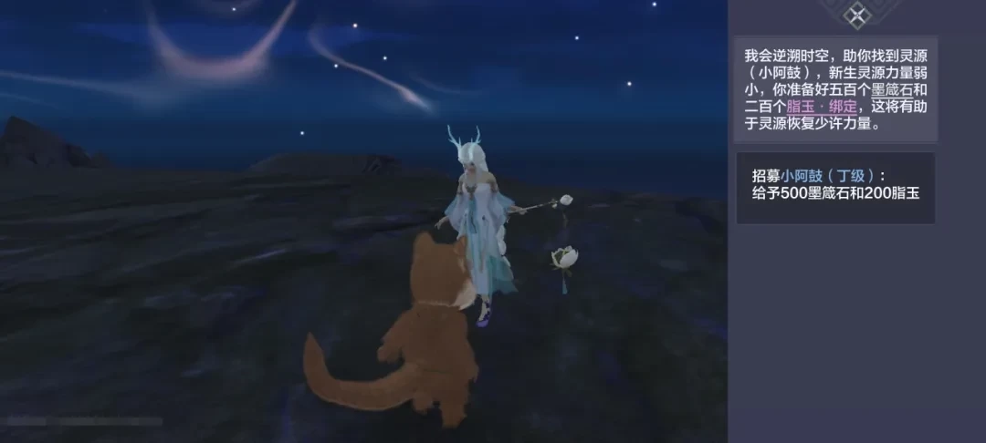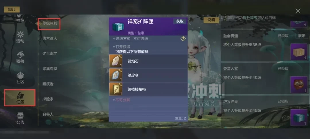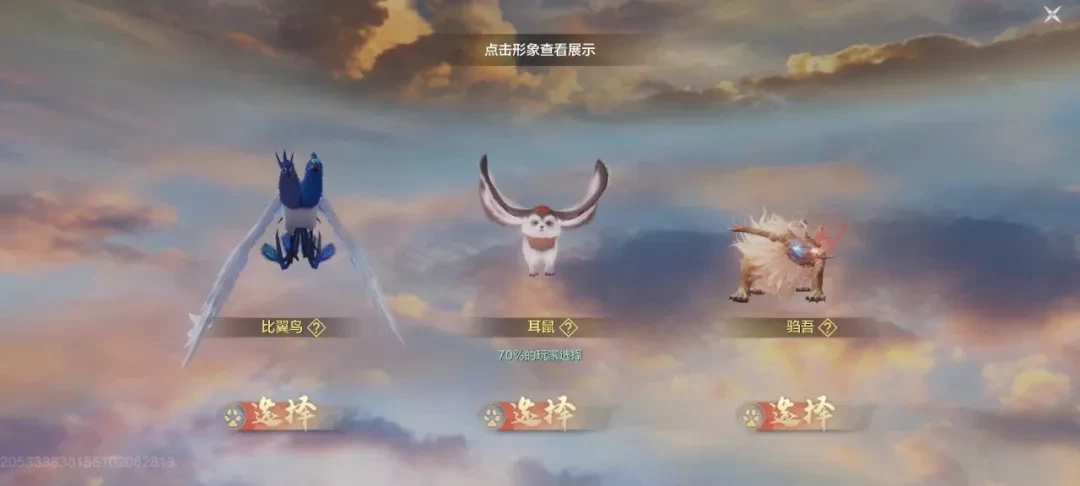 在这一阶段,旅者会获得主线赠送宠物——千年·比翼鸟/耳鼠/驺吾三选一。大家可以根据喜好选择,如果无法抉择,可以先选择千年·耳鼠,耳鼠能打、能飞、斗兽也不弱,适用性更强,后续再通过【山海之路】或是自行合成仍然可以获得另外两只千年宠物。