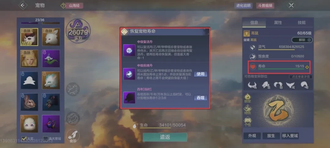 注意,寿命为0时,无法通过吞噬临时宠恢复寿命,需要使用复活丹/祝魂丹复活宠物。