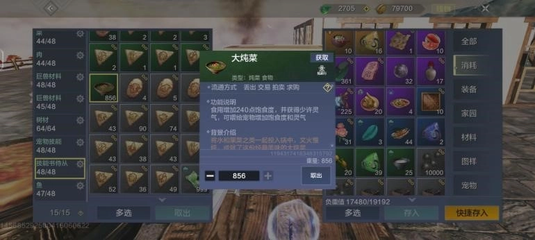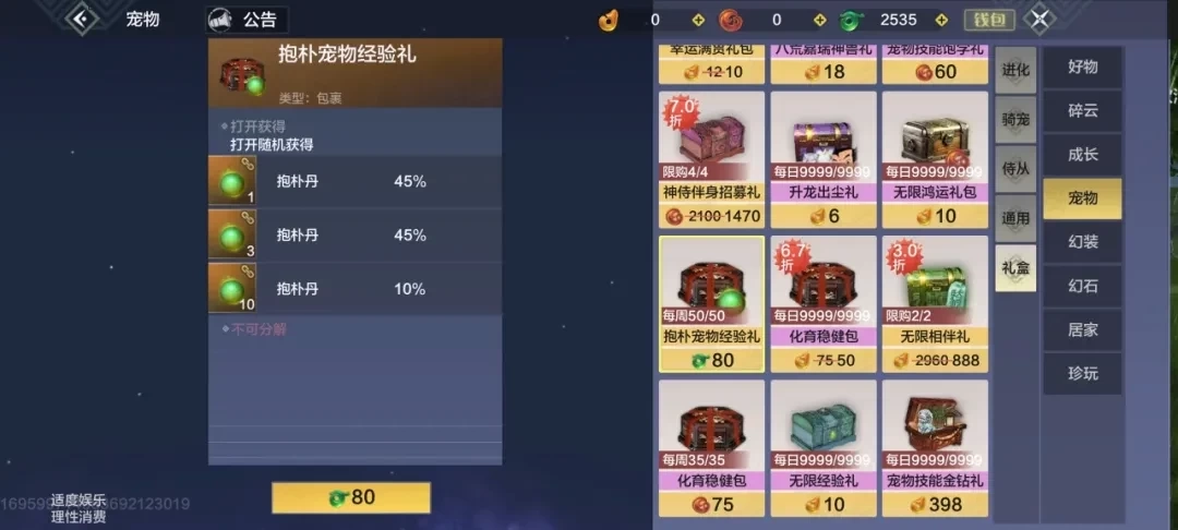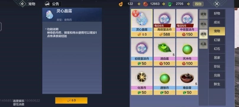 喂食宠物时,可批量喂食经验丹、食物、化育丹;在宠物喂食快捷面板中,可锁定面板,可长按食物、药品置顶,还可自定义设置宠物低于多少血量时自动吃药。