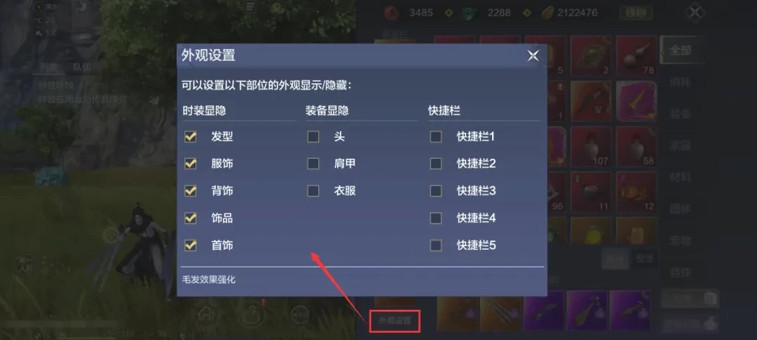 点开背包,可在【外观设置】中设置时装、装备、快捷栏显示隐藏,不喜欢当前形象效果可在此隐藏,不影响时装、装备效果生效。