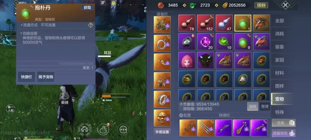 提示:在喂食时要注意宠物的饱食程度。如果宠物的饱食度不是0,它会随时间逐渐减少,并将饱食度转化为灵气(灵气相当于经验值)。一旦饱食度达到上限,就无法再进行喂食或让其吞服元胎了。