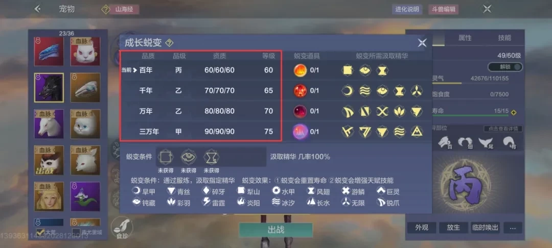 属性转化率区分野宠和进化宠,但是并不影响宠物的实力。宠物的实力以年份区分,分为普通、百年、千年、万年、三万年、五万年。