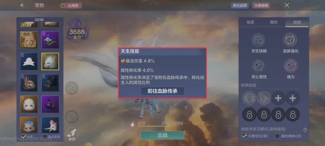 在妄想山海中宠物的天赋血脉各不相同,其中血脉是人物属性的主要来源,普通的宠物血脉属性转化率为4%,而进化兽的血脉属性转化率为5%,所以我们可以优先选择进化兽来培养,虽然普通宠物也可以通过吞噬无限血蛋来提高转化率,但是对于游戏初期资源匮乏的情况而言,进化兽无论在自身强度上还是血脉属性加成上都是第一选择。