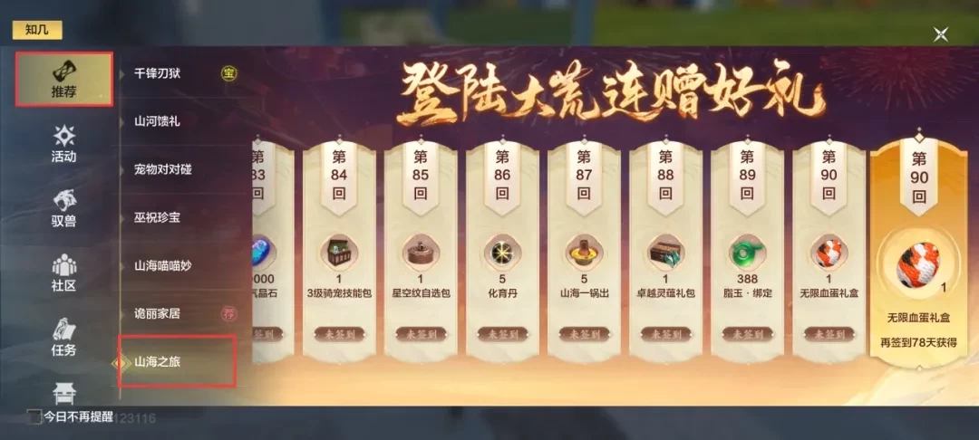 ● 【山海之路】中是宠物、建造、巨兽战斗的引导玩法,完成相应任务可以获得不少珍稀资源。例如【山海之路-宠物之路】可以获得「千年元胎自选包」(千年·耳鼠/比翼鸟/驺吾自选);【山海之路-建造之路】可以获得橙品家具、54格仓库;【山海之路-巨兽之路】可以了解自己当前的战力对应可捕猎巨兽年份,获得装备。