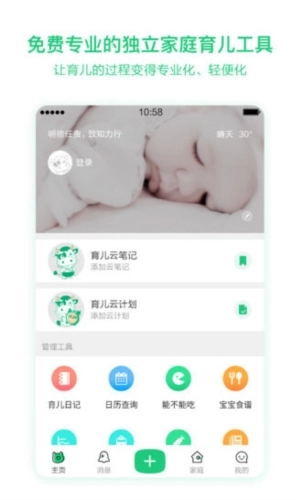 2、宝宝档案创建:在育儿页添加宝宝信息,填写完整资料建立专属档案。