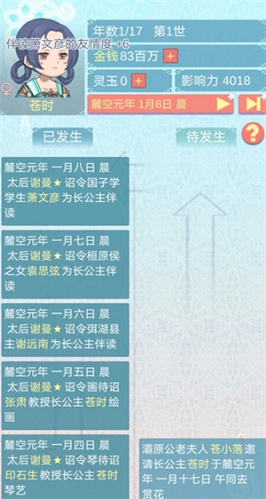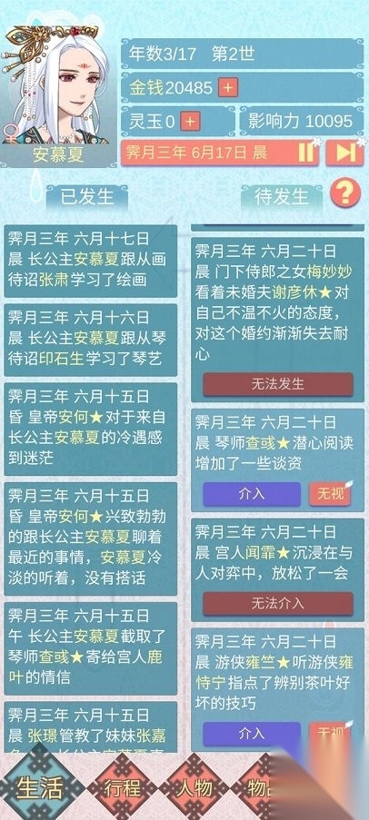 4、左侧显示已发生事件,右侧为待发生随机事件,选择影响命运;