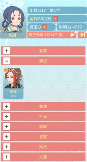 4、谋略:首世仅母后可教导,第二世可介入弟弟事件,建议限制活动范围,将桐宫置顶,亲近列表只留母后以快速提升;