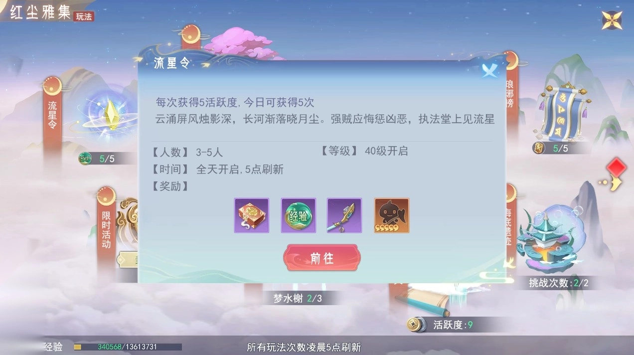 三、流星令&玄宗委托:40级组队日常获装备材料;49级单人任务完成8环可触发抽奖转盘。