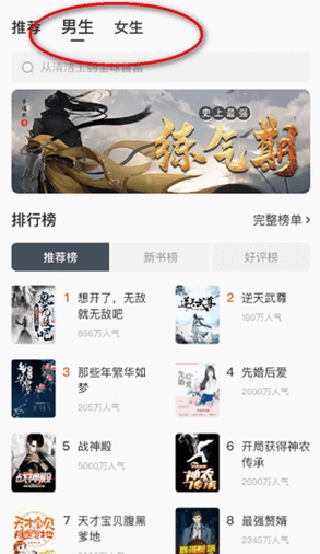 2、首页选择男频/女频内容分区