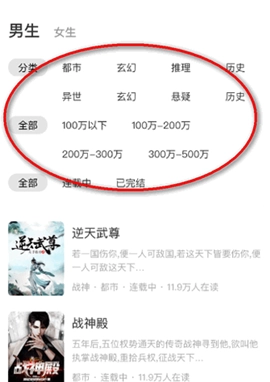 3、通过分类/字数/完本状态筛选作品