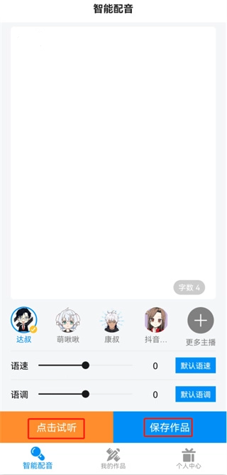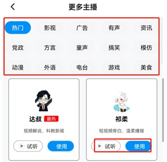 2. 点击“更多主播”图标,浏览并试听不同音色选项。