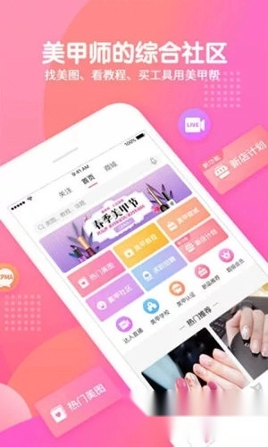点击教程页面,选择视频教程、直播课堂或达人直播入口,学习专业美甲技能。